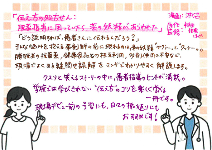 | 伝え方の処方せん:服薬指導に困っていたら薬の妖精があらわれた | 油沼漫画、神田佳典、児島悠史、野田学原作・監著 | 492.3/Ab | POPを見る |
