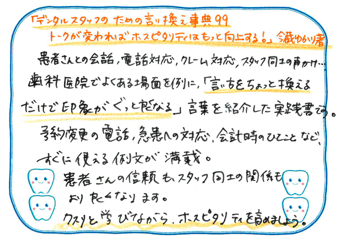 | デンタルスタッフのための言い換え事典99:トークが変わればホスピタリティはもっと向上する! | 今蔵ゆかり著 | 498.1/Im | POPを見る |