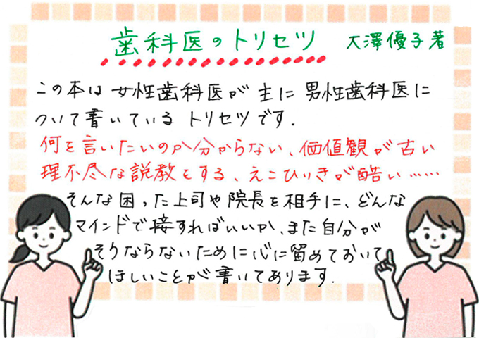 | 歯科医のトリセツ:世間知らずの先生たちと上手に付き合う方法 | 大澤優子著 | 498.1/Os | POPを見る |