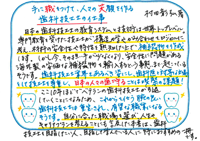 | 歯科技工士の仕事:手に職をつけて、人々の笑顔をつくる | 村田彰弘著 | 498.1/Mu | POPを見る |