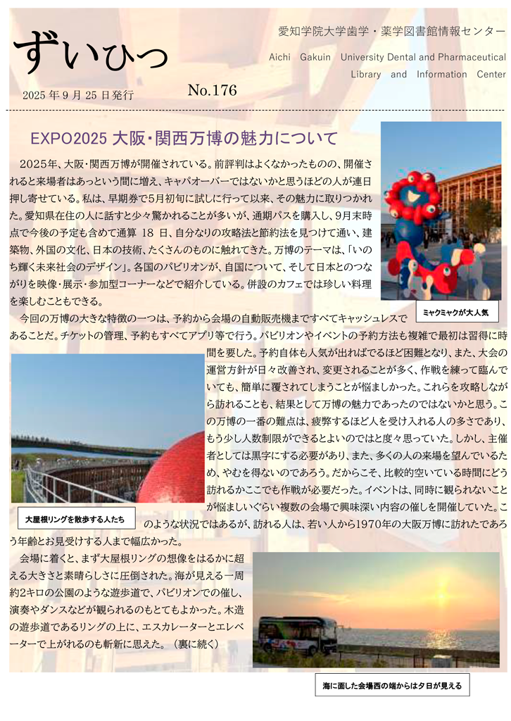内容は図書館のことに限定せず、皆様の知識の幅を広げることを目的としています。当館スタッフが発信する「ずいひつ」が皆様と新しい本との出会いにお役に立てれば幸いです。