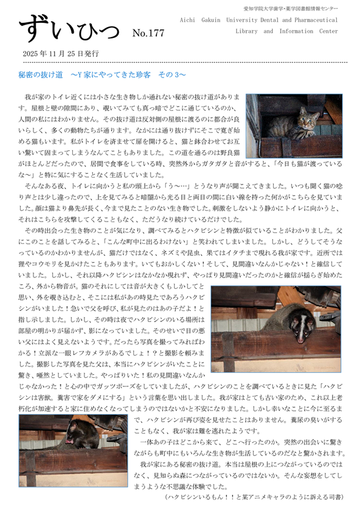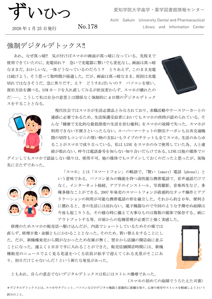 平成17年4月に当館からのお知らせを中心に紙発行でスタートしました「Library News」は、85号より名称を改め、随時発行の「ずいひつ」となりました。