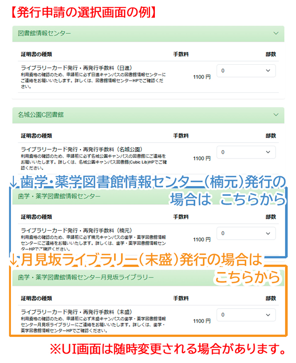 ※発行申請は、受け取りキャンパスにより「歯学・薬学図書館情報センター」または「歯学・薬学図書館情報センター 月見坂ライブラリー」となります。日進キャンパスの「図書館情報センター」、名城公園キャンパスの「名城公園C図書館」とお間違えないようによろしくお願いします。